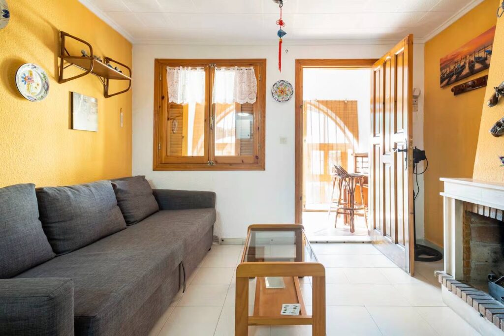 Preciosa casa adosada con barbacoa en la terraza y chimenea interior. Frente a la Pinada de Guardamar del Segura, en urbanización Buenavista. La casa es de un dormitorio, ideal para una pareja. Las vistas son a la pinada de Guardamar y cruzando la pinada se acaba en la playa. El acceso a la playa se hace por un bonito camino elevado de madera que atraviesa la pinada (800 metros). Muy cerca del faro de Santa Pola (en coche) y del pueblo de Guardamar (3 Km.). Aparcamiento en la puerta.